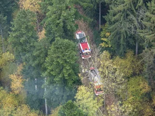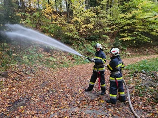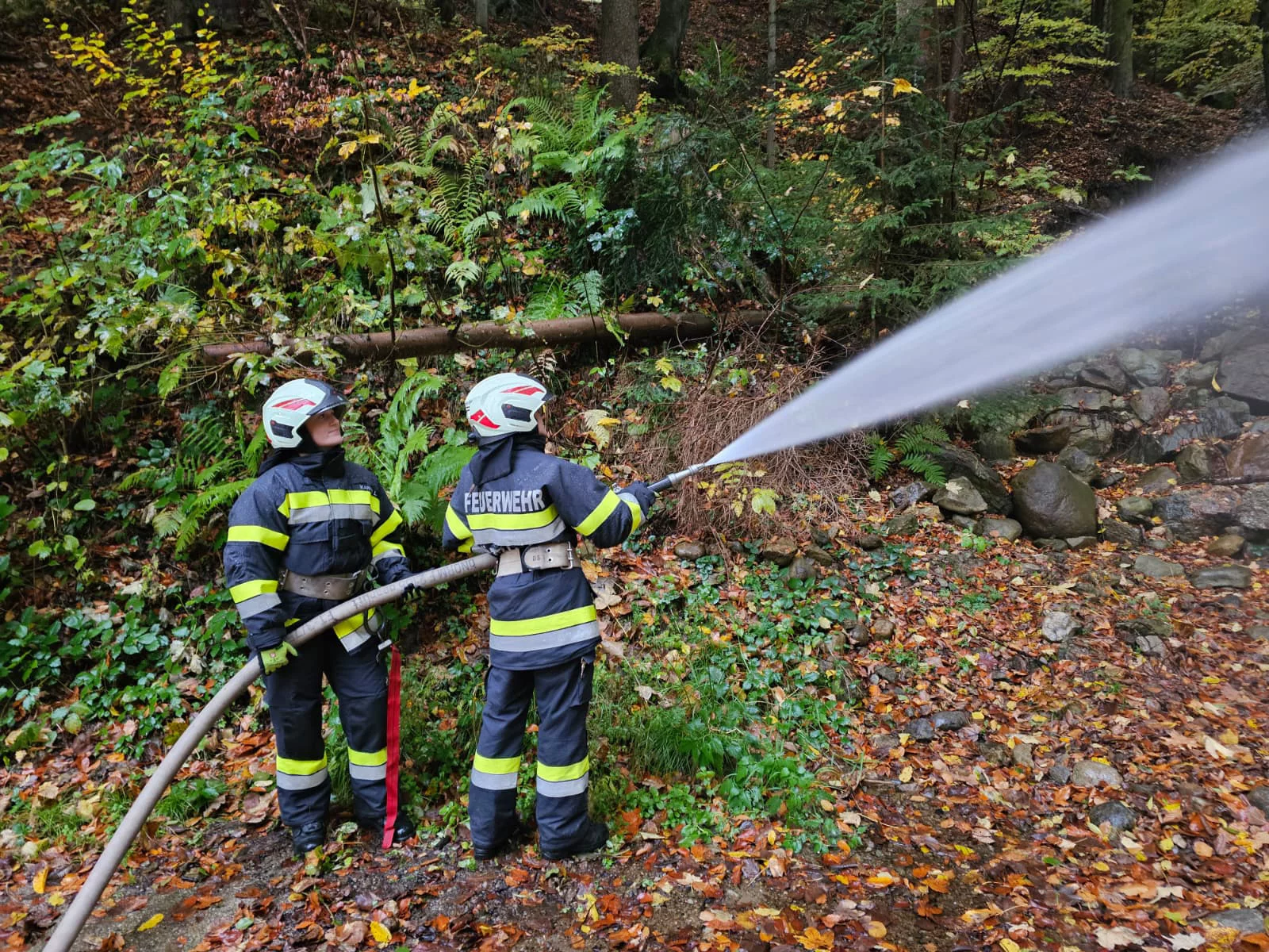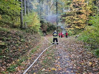 Als erstankommende Feuerwehr begannen wir sofort mit der Waldbrandbekämpfung, während die nachfolgenden Wehren eine Zubringleitung vom Schäffernbach über das steile Gelände errichteten und uns mit Löschwasser versorgten. Außerdem wurde eine Menschenrettung im steilen Gelände mittels MRAS (Menschenrettung und Absturzsicherung) beübt. Insgesamt nahmen 8 Feuerwehren mit rund 100 Einsatzkräften teil, darunter auch die Nachbarwehr Hochart aus dem Burgenland.